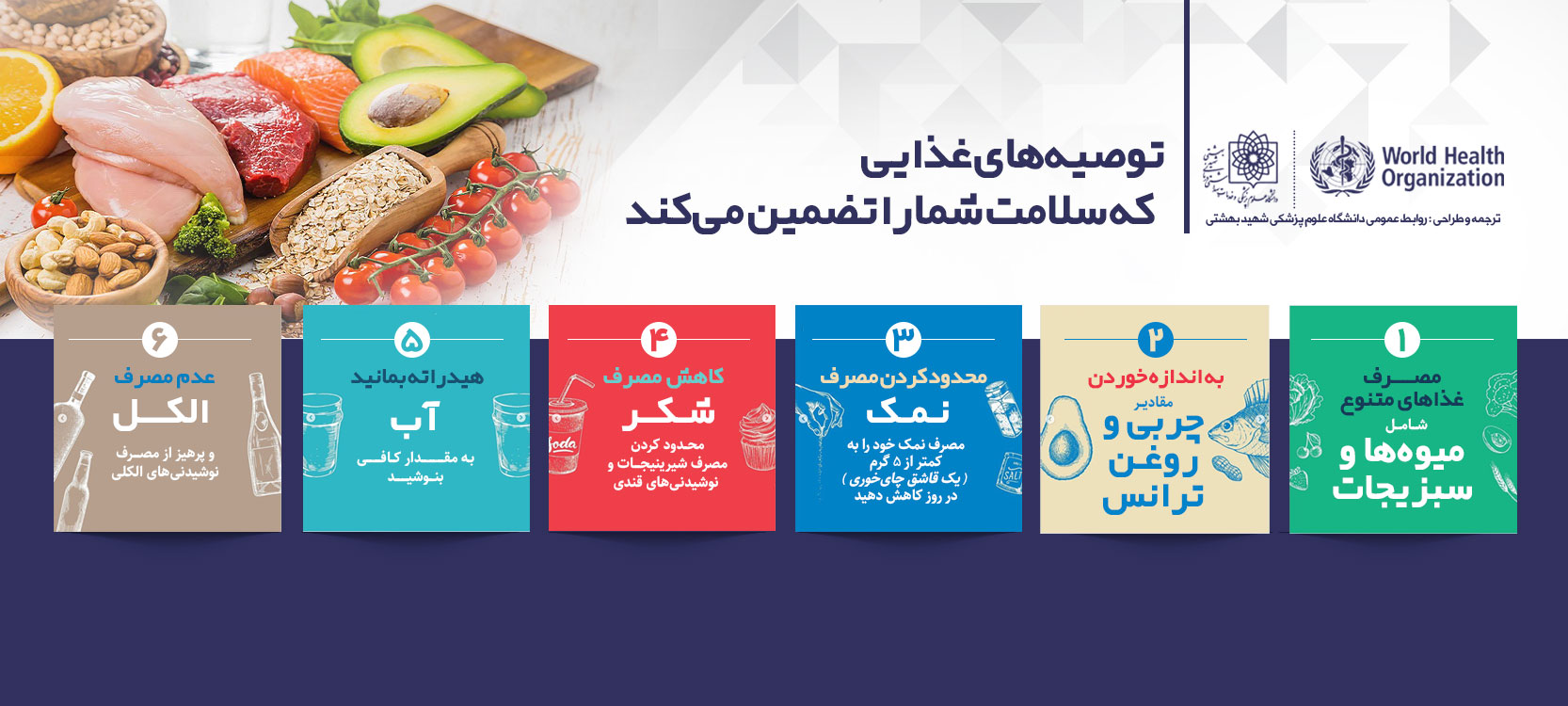 معاونت درمان به گزارش روابط عمومی دانشگاه علوم پزشکی شهید بهشتی و به نقل از سازمان جهانی بهداشت، مصرف غذاهای متنوع ، محدود کردن مصرف نمک، کاهش مصرف شکر، خودداری از مصرف الکل، نوشیدن مقدار کافی آب و کنترل مصرف چربی و روغن ترانس از مهمترین نکاتی هستند که با رعایت آن ها می توان رژیم غذایی سالمی داشت.