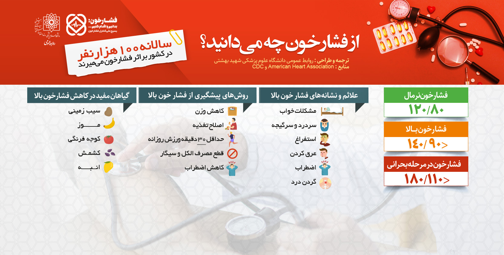 هر سال بیماری فشارخون ، جان ۱۰۰ هزار نفر از مردم ما را می گیرد و فشارخون نه تنها باعث مرگ سالانه ۱۰۰ هزار نفر در کشور می شود، بلکه آسیب های زیادی مانند سکته های قلبی و مغزی و معلولیت  را برای بیماران به همراه دارد.