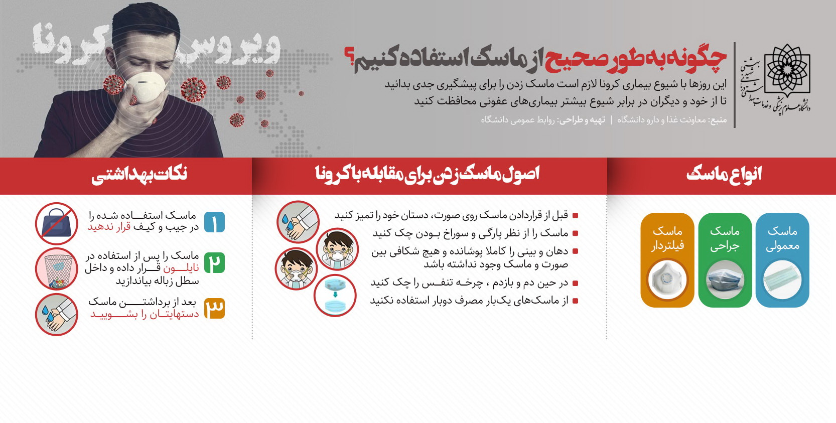 ۴-پس از برداشتن و دور انداختن ماسک دوباره دست هایتان را بشویید تا آلودگی منتقل شده به دست هایتان را از بین ببرد.